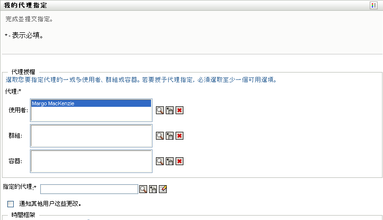 注:在您更改某个代理指派的许可权限之后,User Application 不会立即将您从代理模式注销。这让您可以更改错误的值。因此,如果您在处于代理模式时删除了某个代理指派,则即使在去除该代理指派之后,您仍然能够编辑该代理指派,并且还可以处理代理用户的任务。