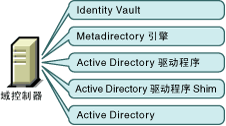 可通过 Active Directory 域控制器在独立的计算机上安装 Identity Vault、Metadirectory 引擎和驱动程序。 使用此配置则不需要在域控制器上安装任何 Identity Manager 软件。