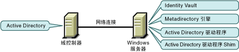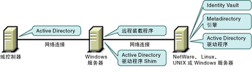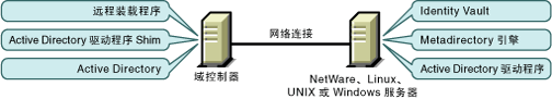 可以在 Active Directory 域控制器上安装远程装载程序和驱动程序 Shim,但需要在独立的服务器上安装 Identity Vault 和 Metadirectory 引擎。