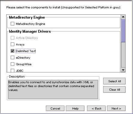 默认情况下,当您安装 Metadirectory 引擎时将同时安装 Identity Manager Driver for Delimited Text。 如果那时未安装此驱动程序,本节将帮助您安装它。