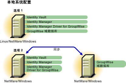 本地安装就是将驱动程序安装在已安装 Identity Manager 和 eDirectory™ 的同一台 Windows、Linux 或 NetWare® 计算机上。 GroupWise 域数据库可位于同一台计算机或不同计算机上。