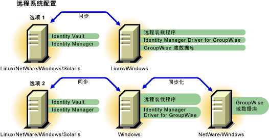 如果远程装载程序在 Windows 上运行,如Figure 2-2 中的选项 2 所示,GroupWise 所安装的系统就可以与 Metadirectory 引擎所安装的系统和远程装载程序所安装的系统不同。