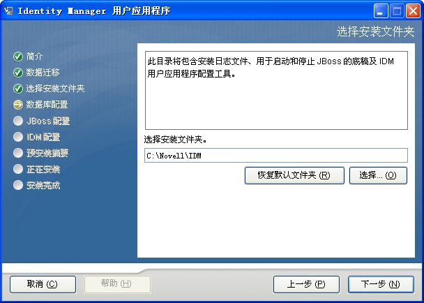 在“选择安装文件夹”页,选择安装 User Application 的位置。如果要使用默认位置,单击恢复默认文件夹;如果要为安装文件选择其他位置,单击选择并浏览至某个位置。