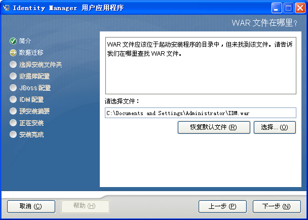 如果 Identity Manager User Application WAR 文件所在的目录不同于安装程序,安装程序将提示提供 WAR 的路径。