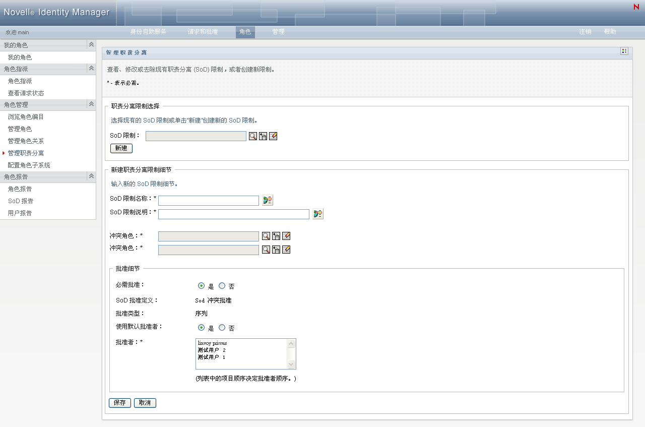 页面访问 “管理职责分离”页面可由角色管理员或安全专员访问。安全专员需要身份库中 SoDDef 容器的浏览权限,但不需要角色的浏览权限。