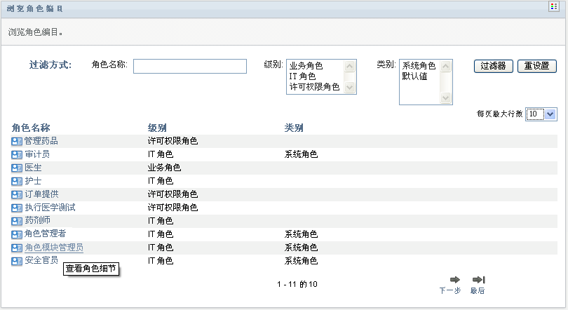 要查看某个特定角色的细节,请在列中单击该角色名称。