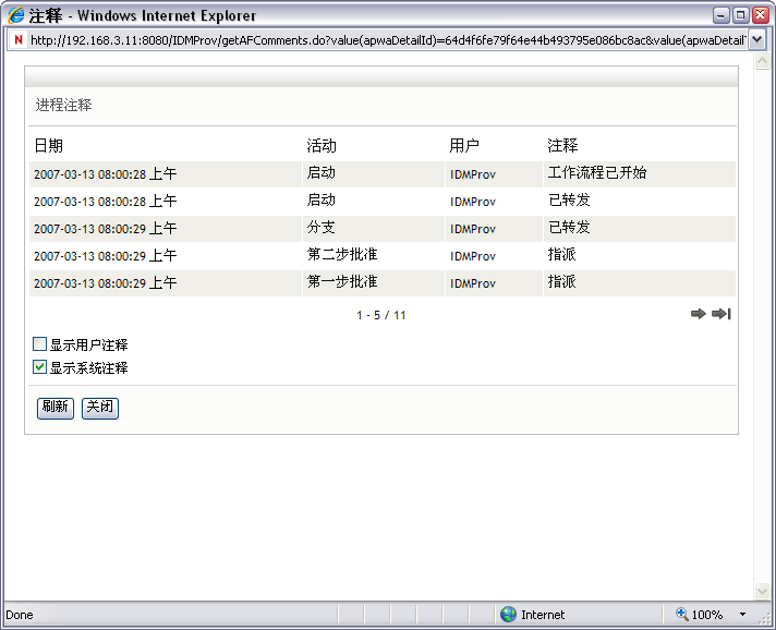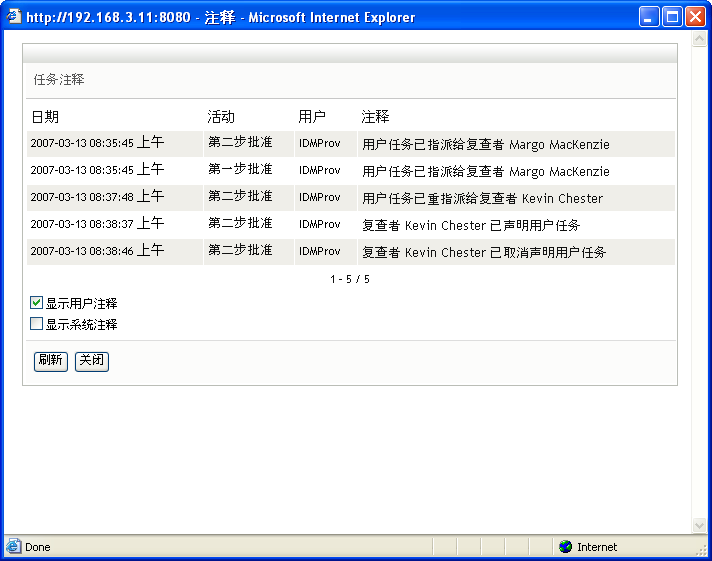 可通过弹出窗口查看用户和系统注释。注释显示的顺序由和每条注释关联的时戳决定。先输入的注释先显示。对于并行批准流程,并行处理的活动顺序可能是不可预测的。