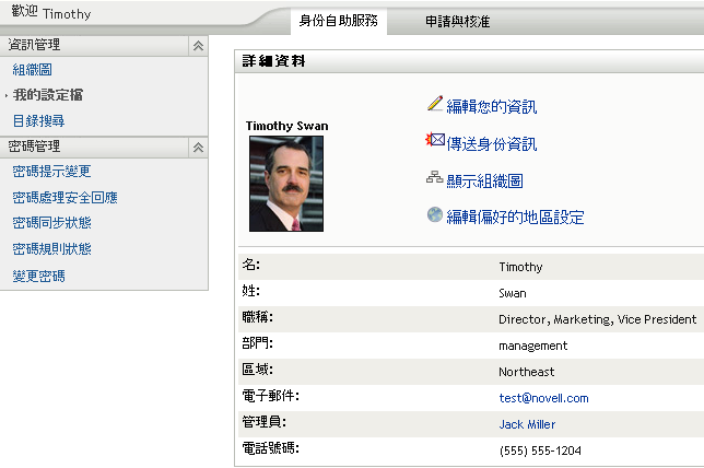 以下场景显示某个用户如何链接到另一用户和组细节。 Timothy Swan(市场营销部副总经理)登录 Identity Manager User Application,然后进入“我的配置文件”页面: