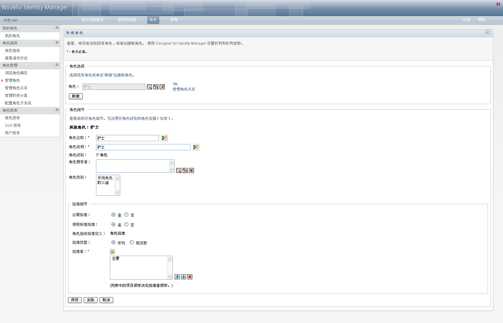 可以通过 Identity Manager 用户界面的选项卡上的操作创建新角色或者修改或删除现有角色。