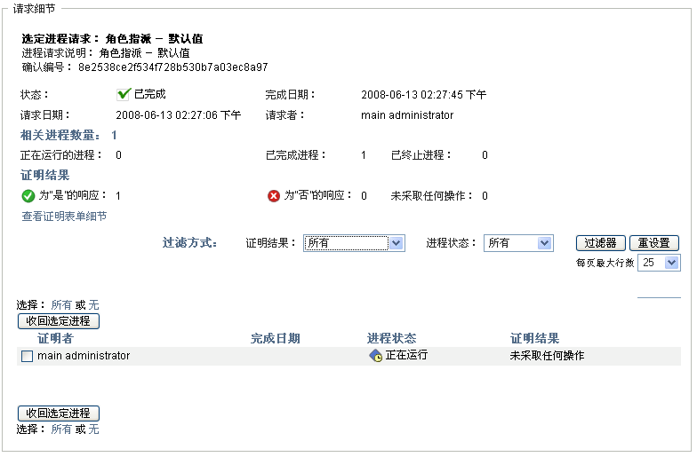 操作使您可以查看证明请求的状态。此外,还使您可以查看为某个请求启动的各个工作流程的状态并可选择收回一个或多个正在运行的流程。
