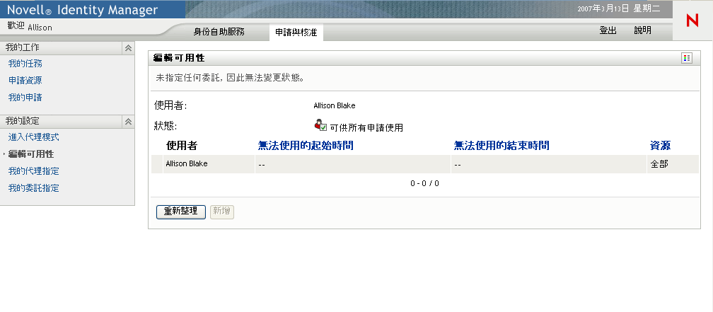如果没有为您指派委托,User Application 将显示一条讯息,指示您不能在“编辑可用性”页上更改状态。