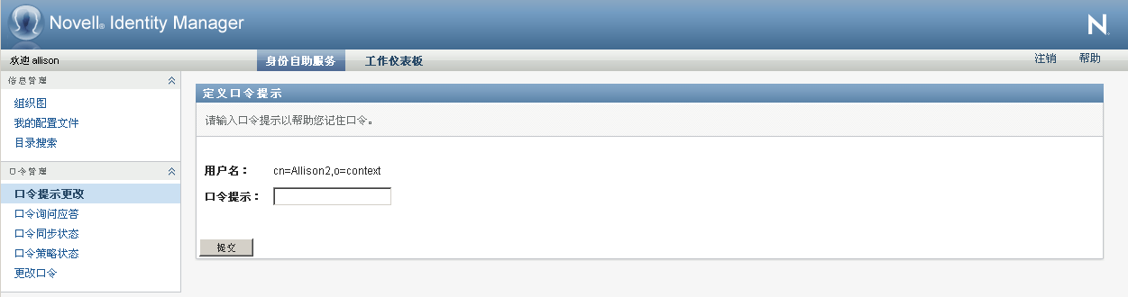 在身份自助服务选项卡上,单击菜单中的口令提示更改(在口令管理下方)。