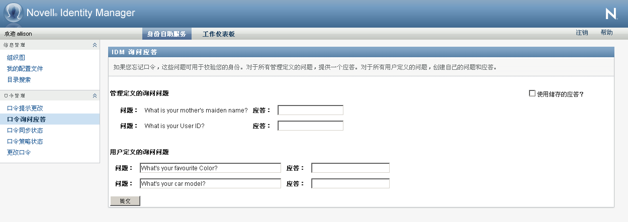 指定您自己的问题和这些问题的有效应答(如果您的口令策略启用了此功能)