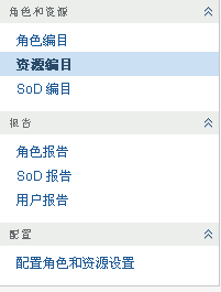 角色和资源选项卡的左侧显示可以执行的操作的菜单。这些操作按照类别(角色和资源、报告和配置)列出:
