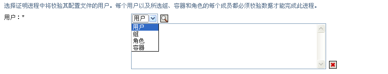您必须至少选择一个用户、组、角色或容器才能起动证明流程。但是,不要求您必须选择用户、组、角色或容器才能保存请求。