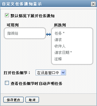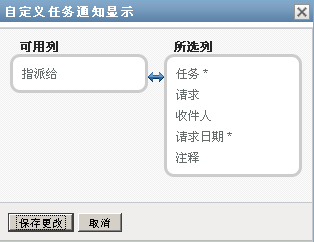 通过“工作仪表板”页面的“任务通知”部分,您可以选择和取消选择列,以及对任务列表显示内容中的列重新排序。该行为由“自定义任务通知显示”对话框中的一个设置控制。