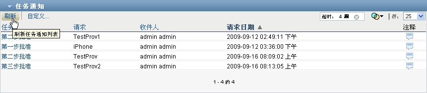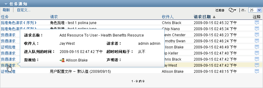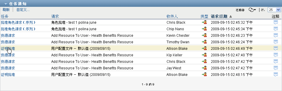 对于资源和角色请求,任务列表中的列指定(在获得所需批准的情况下)将接收资源或角色的用户或组。对于证明请求,列指定证明者的姓名。