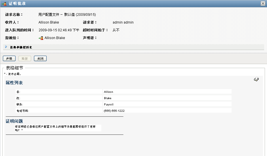 声明与某个证明请求相关联的任务时,您需要审阅证明表单中显示的信息。此外,您还需要回答必需的证明问题,这些证明问题指示您是否证明数据的正确性,而且在某些情况下,需要响应一个或多个调查问题。对于用户简介证明流程,表单包括您的用户属性数据(您需要校验其是否准确)。对于角色指派、用户指派和 SoD 证明流程,表单包括显示您需要校验的角色指派、用户指派或 SoD 数据的报告。