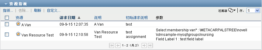 此时会显示资源的列表。如果您不处于受管模式,则所显示的资源指派是您作为收件人的那些资源指派。如果您处于受管模式,则所显示的资源指派是选定用户、组或容器作为收件人的资源指派。对于组和容器,所列出的资源是通过角色指派间接指派给选定组或容器的那些资源。组或容器的资源指派列表不包含直接指派给选定组或容器中的用户的资源。