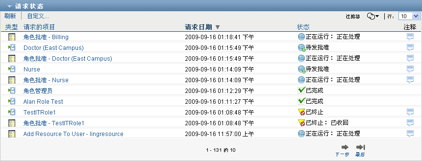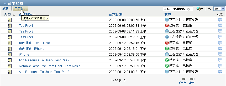 要查看请求的类型,您需要在显示内容的列的列表中包含列。包含列之后,User Application 会显示一个图标,指示请求是处理(供应)请求、角色请求还是资源请求。
