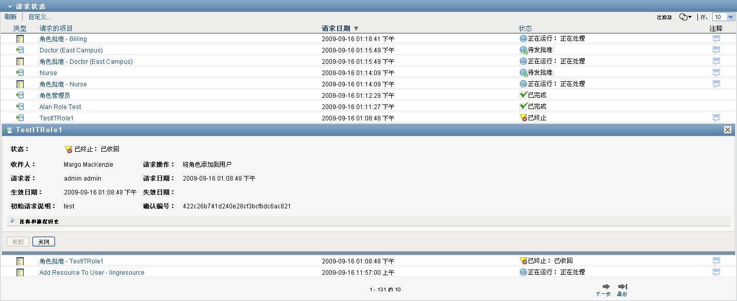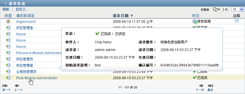 注:如果角色服务驱动程序所在服务器上的系统时钟与正在运行 User Application 的服务器上的系统时钟不同步,“请求状态”和“角色指派”列表上的请求状态可能会不同。例如,如果请求了一个不需要批准的角色指派,可能将看到“请求状态”部分的状态显示为“已供应”,但“角色指派”部分的状态显示为“待发激活”。如果等待一分钟左右,可能将看到“角色指派”部分的状态更改为“已供应”。要确保整个 User Application 正确显示状态,请检查系统时钟以确保同步正确。