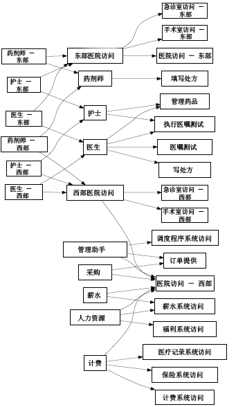 角色层次结构支持三个级别。最高级别定义的角色(称为“业务角色”)定义组织内具有业务意义的操作。中级角色(称为“IT 角色”)支持技术功能。层次结构最低级别定义的角色(称为“许可权限角色”)定义较低级别的特权。以下示例显示一家医疗组织的样本角色层次结构,其中包含三个级别。层次结构的最高级别位于左侧,最低级别位于右侧: