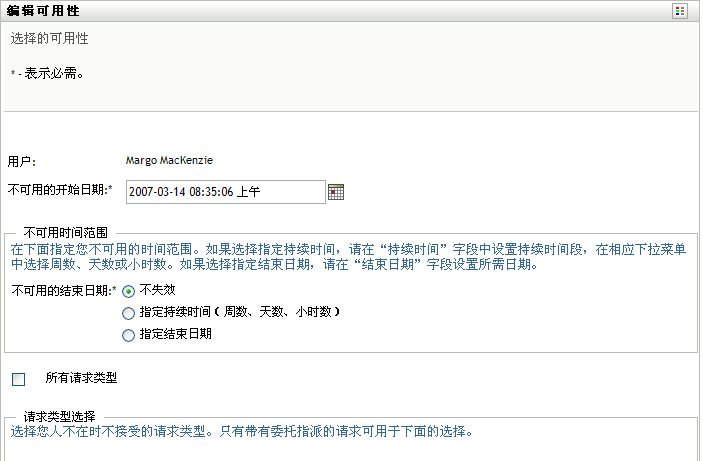 User Application 将显示一组控件,可使用这些控件指定您处于不可用状态的时间段,以及选择该设置适用于的请求。
