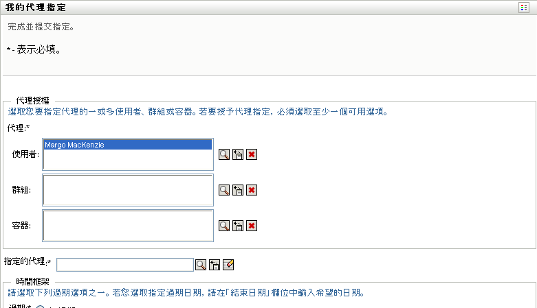 注:在您更改某个代理指派的许可权限之后,User Application 不会立即将您从代理模式注销。这让您可以更改错误的值。因此,如果您在处于代理模式时删除了某个代理指派,则即使在去除该代理指派之后,您仍然能够编辑该代理指派,并且还可以处理代理用户的任务。