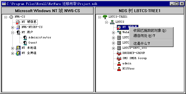 收回已拖放的对象 ---要将已拖放的对象返回其原位置,请在 NT 域或目标 NDS 树中右击已拖放的 NT 对象,然后单击“收回已拖放的对象”。