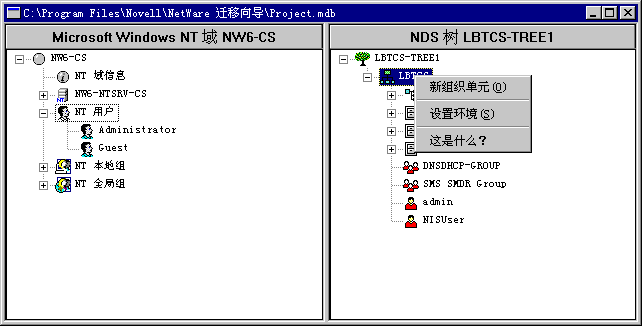 大部分操作都将在“工程窗口”中完成,在这里,可以将 NT 用户和组对象拖放到 NDS 树枝中,将 NT 文件夹和卷拖放到目标 NDS 树的任何卷或文件夹中。
