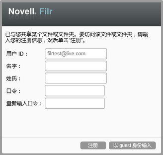 然后,该用户必须在 Filr 站点上进行注册以便登录。(在 Filr 1.1 先前版本中,用户可以使用他们的 Google 或 Yahoo 帐户登录到 Filr 站点。在 Filr 1.1 和更高版本中,此功能对新的 Filr 用户不再可用。有关此次更改的详细信息,请参见 Novell Filr 1.1 自述文件)。