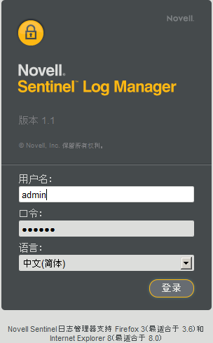 安装期间创建的管理员用户可登录到 Web 界面配置和使用 Sentinel Log Manager: