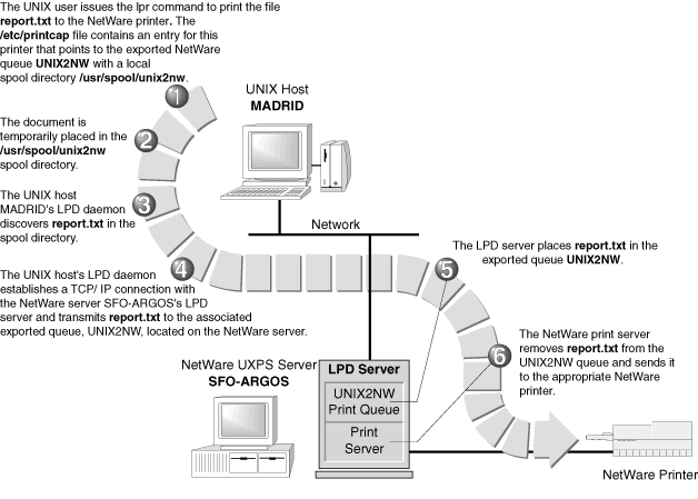 The UNIX host uses the LPD protocol to transmit print commands and print jobs to the NetWare server. Therefore, each UNIX host that sends print jobs to an exported NetWare queue must support and run the lpd daemon.