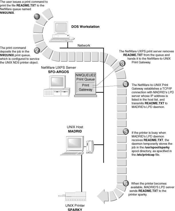 The print server takes jobs from the print queue and passes them to the NetWare-to-UNIX print gateway. The print gateway then sends the print job to the remote UNIX host.