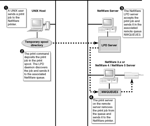 The UNIX host uses the LPD protocol to receive print commands and print jobs from the NetWare server. Therefore, each UNIX host that receives print jobs from the NetWare-to-UNIX print service must support and run the lpd daemon.