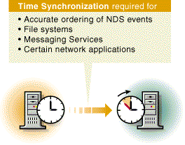 Novell's directory service---NDS---requires that all internal clocks on all servers in an NDS tree be synchronized so that updates to objects on the tree can be ordered correctly. Time synchronization also affects other system functions as illustrated in the following graphic.