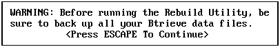IMPORTANT: Before running the Rebuild utility, make sure you have unloaded your previous version of Btrieve (as described on Unloading an Earlier Version of NetWare Btrieve), started Btrieve 6.1x (as described in Starting NetWare Btrieve 6.x), and backed up all your data files. Having backup copies ensures against data loss if a power interruption occurs while you are running the utility.