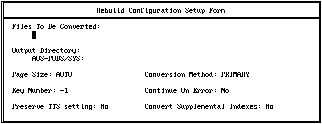 NOTE: You can specify a different directory for storing these files by using the -B option when running the Rebuild utility from the command line, or by using the Output Directory option on the Setup Form screen when running the utility interactively.