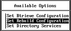 You can run the Rebuild utility interactively through the Set Rebuild Configuration option on the Setup utility's Available Options menu. As the following sections explain, you can use the Set Rebuild Configuration option to perform the following tasks: