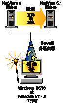 下图显示了“Novell 升级向导”对从 NetWare 3 服务器到 NetWare 5.1 服务器的数据迁移进行管理的过程。
