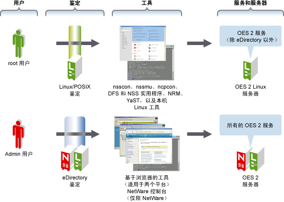 如图 11-1所示,Open Enterprise Server 提供一组丰富的服务管理工具和服务器管理工具,包括可帮助您实施和维护网络的基于浏览器和基于服务器的接口。大多数这些管理接口的访问权限均由 eDirectory™ 控制。但是,有少数接口(如 SUSE Linux Enterprise Server 10 服务器上的 YaST)需要本地鉴定。