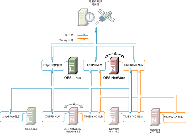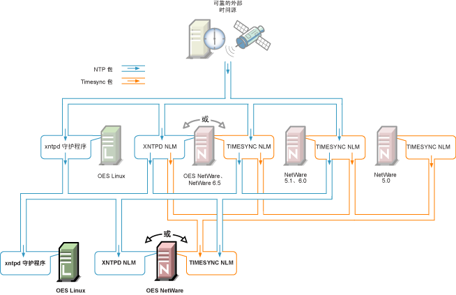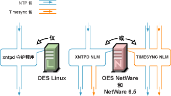 由于 OES 2 Linux 和 NetWare 服务器必须相互通讯才能进行时间同步,同时 Linux 只能使用 NTP 进行时间同步,因此 Linux 和 NetWare 必须通过使用 NTP 时间包交换时间同步信息。