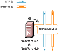 图 12-3说明了虽然 NetWare 5.1 和 6.0 不包含 NTP 时间模块,但是它们可以使用并传递 NTP 时间包。