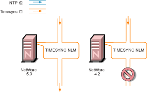 NetWare 的早期版本(4.2 版到 6.0 版)不包含 NTP 时间模块。因此,它们的时间同步选项的限制更多。