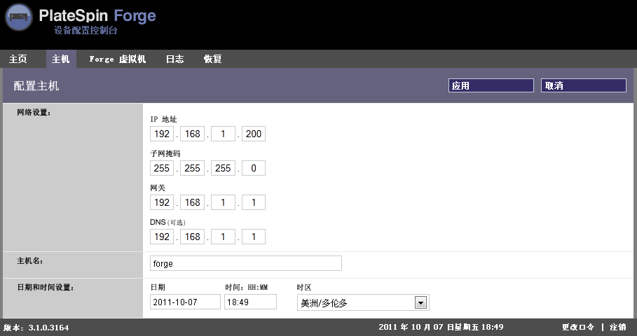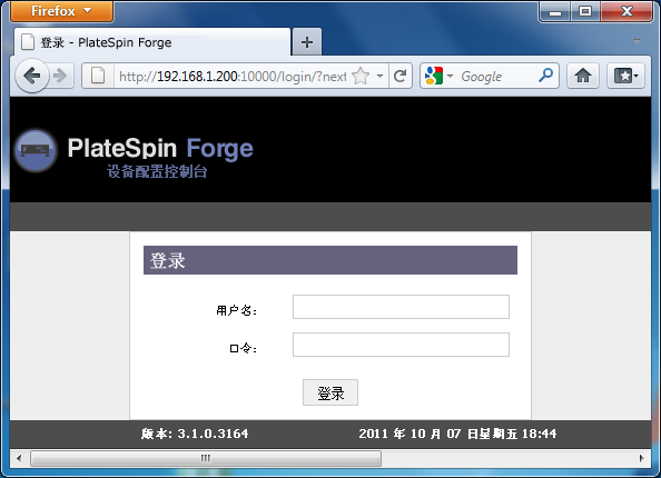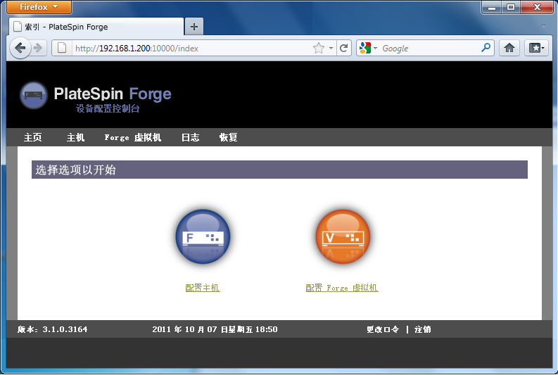 在初始通电时,请确认是否显示“PlateSpin Forge Configuration”(PlateSpin Forge 配置)对话框。