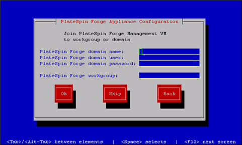 选择 (是)来打开“Join PlateSpin Forge Management VM to Workgroup or Domain”(将 PlateSpin Forge 管理 VM 加入工作组或域)对话框: