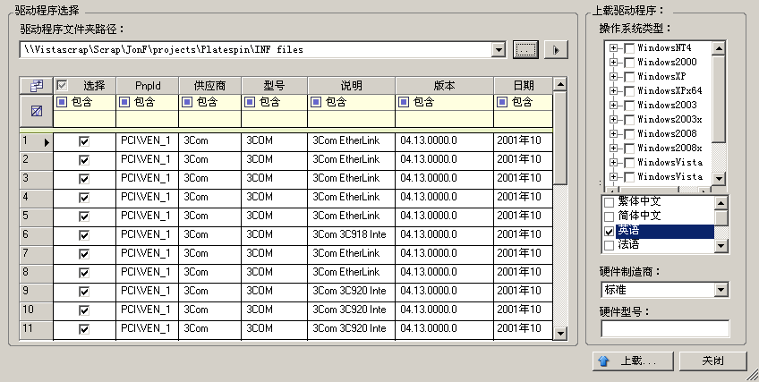 单击,浏览到包含所需驱动程序文件的文件夹,选择合适的操作系统类型、语言和硬件制造商选项。