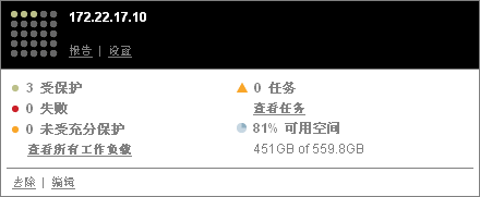每张卡上的超链接都使您可以导航到该特定实例的“工作负载”、“报告”、“设置”和“任务”页面。还有其他超链接可用于编辑卡的配置或从显示中去除卡。