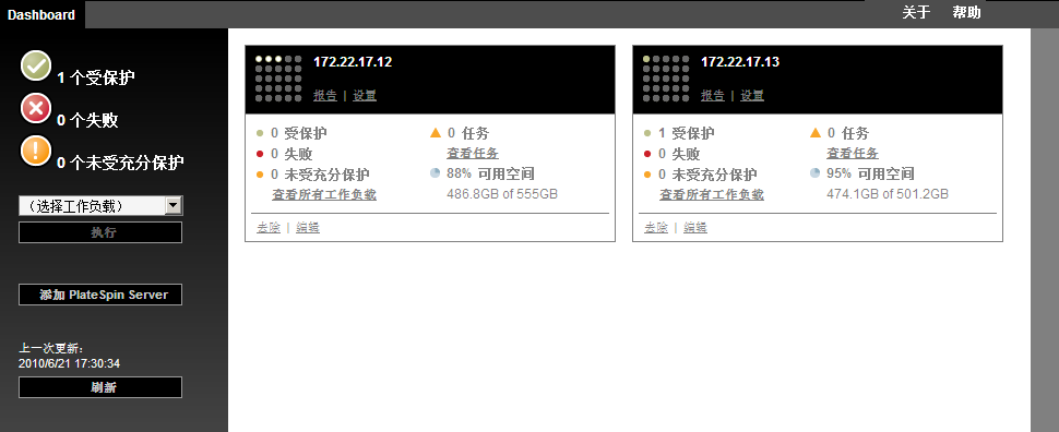 PlateSpin Protect 中包含基于 Web 的客户端应用程序,即 PlateSpin Protect 管理控制台,它可用来对多个 PlateSpin Protect 和 PlateSpin Forge 实例进行集中访问。