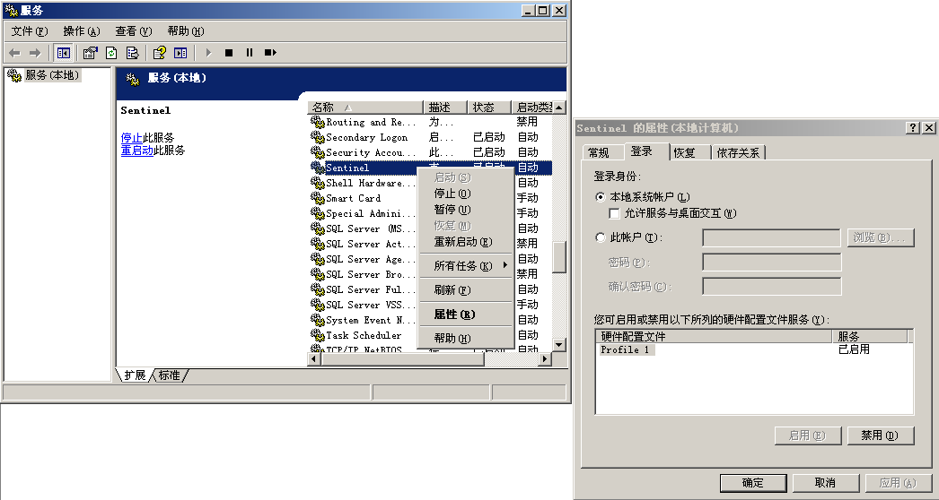 右键单击 Sentinel,然后选择。